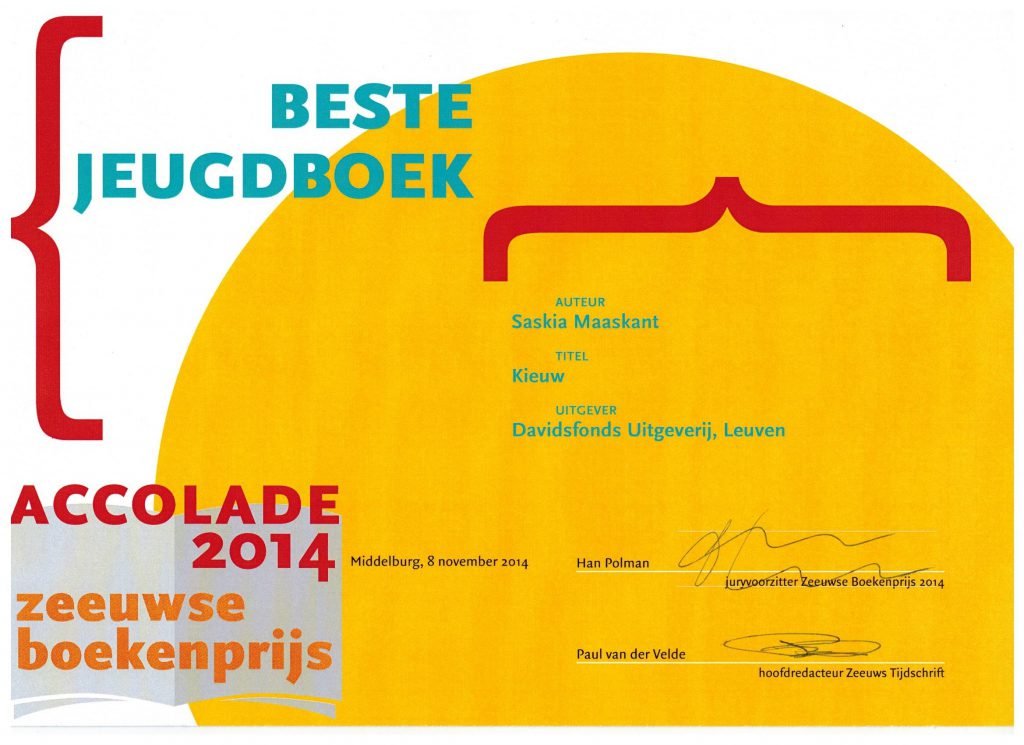 heeft de Accolade voor het ‘Beste Jeugdboek’ toegekend aan Saskia Maaskant voor het boek Kieuw (uitgeverij Davidsfonds, Leuven).